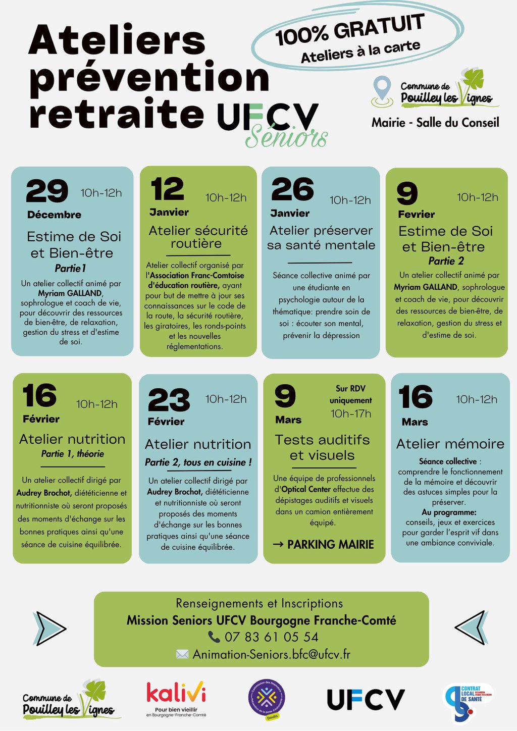 L’association UFCV, en partenariat avec le CCAS de Pouilley-les-Vignes, propose une série d’ateliers gratuits dédiés aux retraités et futurs retraités. Ces ateliers, axés sur la prévention et le bien-être, abordent des thématiques essentielles :