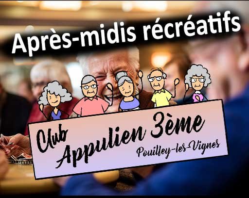 Le club Appulien 3ème vous propose ses après-midis récréatifs, les jeudis de 13h45 à 17h30 à la Maison de la culture de Pouilley-les-Vignes.