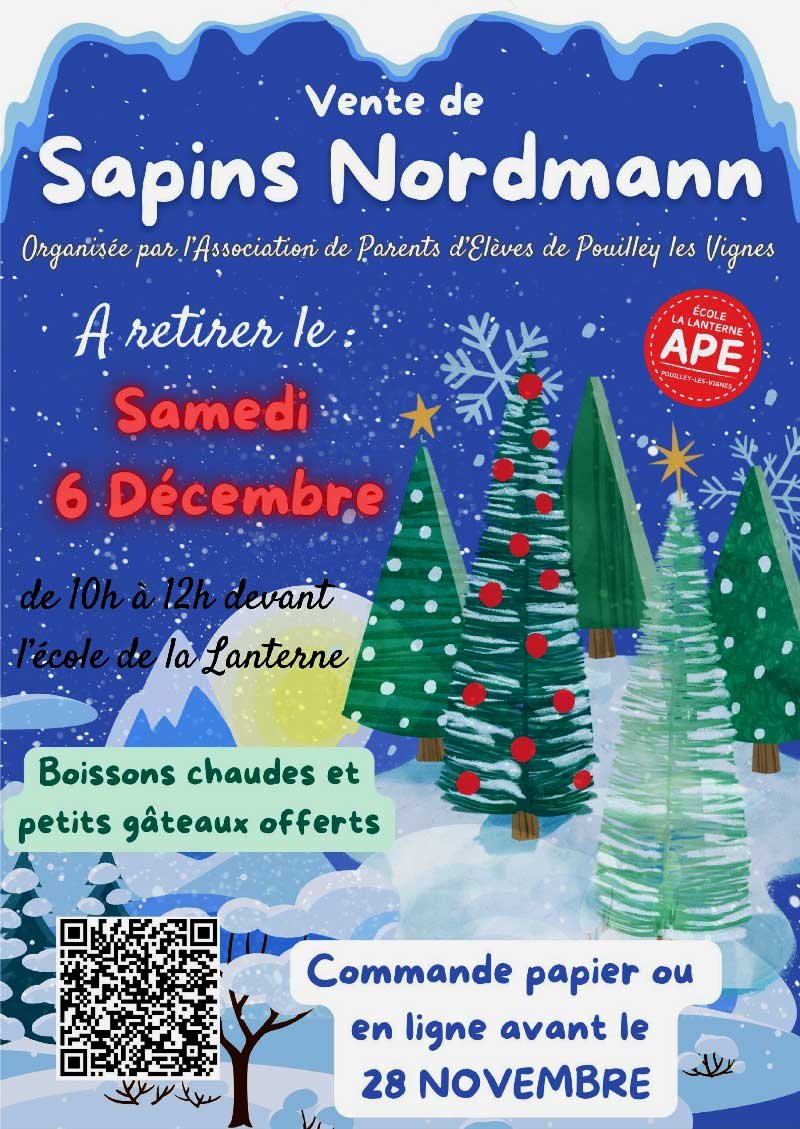 Comme chaque année, l'Association des Parents d'Élèves de Pouilley-les-Vignes organise sa traditionnelle vente de Sapins de Noël (sapin Nordmann coupé de 1er choix).