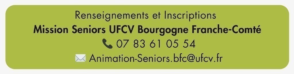 Chacun peut participer à un ou plusieurs ateliers en s'inscrivant par tél : 07 83 61 05 54 ou par mail : animation-seniors.bfc@ufcv.fr