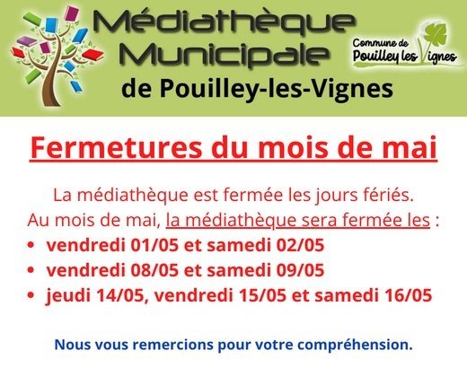 La médiathèque sera fermée durant les jours fériés et ponts du mois du mai.